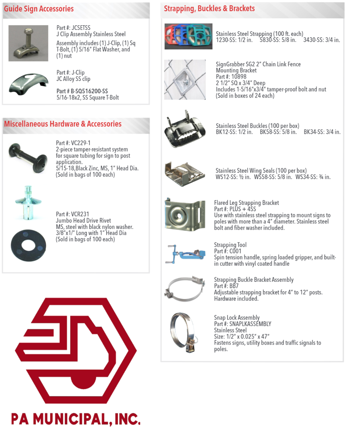 Secure mounting components for dependable field installations. PA Municipal, Inc. supplies strapping, brackets, and tools that help municipalities, contractors, and public works crews mount signs and related equipment with confidence. Designed for strength and compatibility, these products support efficient installations in roadway, facility, and infrastructure environments.
